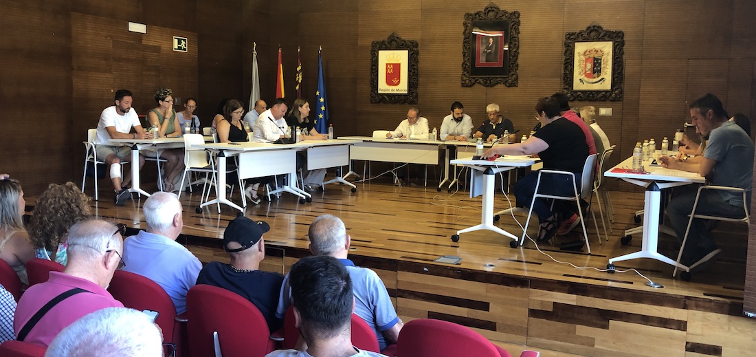Lleno en el salón de actos de la Casa del Piñón para asistir al primer pleno extaordinario de la nueva corporación municipal del Ayuntamiento de La Unión, que ha tenido el asunto de los salarios del equipo de gobierno por epicentro de un debate que se vio aderezado por tensiones e interrupciones. Al final salieron aprobados por 11 votos favorables frente a 10.