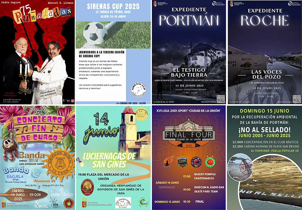 El humor abre la agenda esta noche con '75 puñaladas', para el sábado acoger el inicio del torneo alevín de fútbol-8 'Sirenas Cup' y de la 'Final a cuatro' de la liga de baloncesto, además de tres partidos del CD Vedruna de fútbol sala, con posible título de campeón para infantil. Fuera del deporte, mañana trae el concierto de fin de curso de la agrupación musical, la ruta solidaria de las 'Luciérnagas de San Ginés' y los dos 'escapes callejeros' de Portmán y Roche. Para el domingo es el llamamiento a todos los vecinos del municipio para formar una cadena humana junto a la bahía para expresar un rotundo 'No al sellado'.