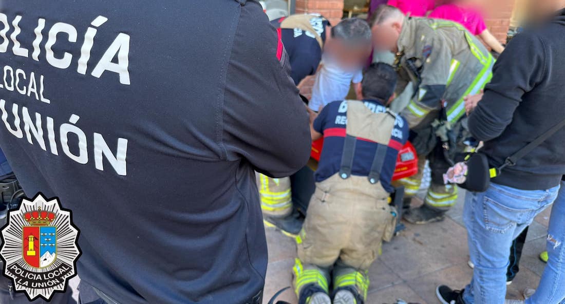La Policía Local de La Unión acudió en auxilio de un menor que quedó atrapado en un coche de monedas para diversión infantil. Después llegaron los bomberos y el chaval pudo salir.