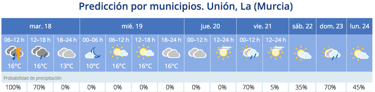 La Agencia Estatal de Meteorología (AEMET) avisa de un chubasco tormentoso que se desplaza desde Águilas hacia los municipios de La Unión y de Cartagena, donde la previsión apunta que puede llegar a descargar hasta 30 litros por metro cuadrado en una hora. También se indica que a las seis de la tarde acaba el riesgo de lluvias.