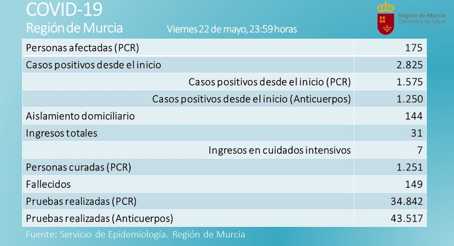 A nivel nacional, se han registrado en el último día 446 nuevos casos y son ya seis días con el número de fallecidos por debajo de la centena, mientras que en la Región de Murcia no se registran defunciones y hay tres hospitalizados menos.