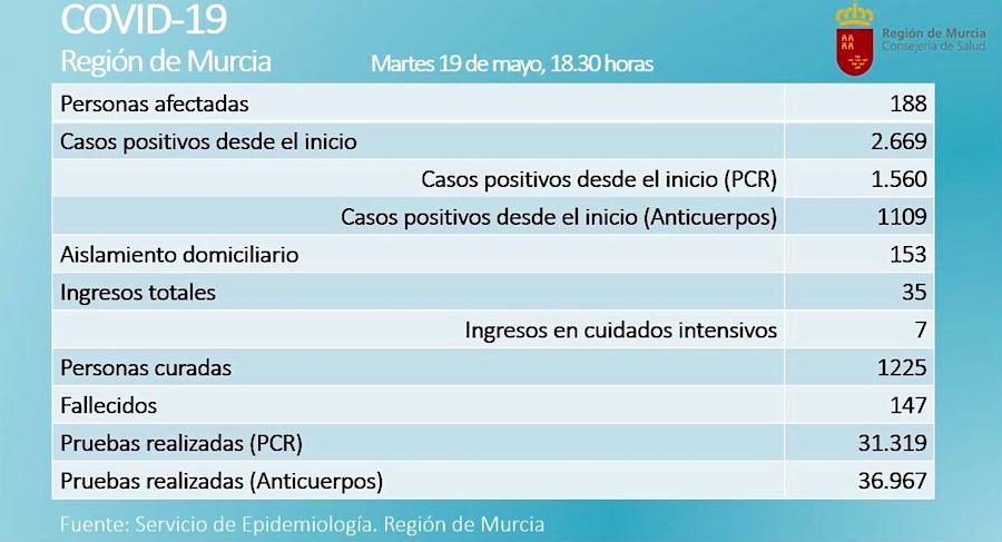 Los datos que ofrece el Servicio de Epidemiología muestran un descenso de 7 personas afectadas por el coronavirus en el territorio regional y que también bajan en 2 los hospitalizados, mientras que suben los fallecidos y los curados. El total de pruebas de diagnóstico efectuadas en el último día es de 1.734.