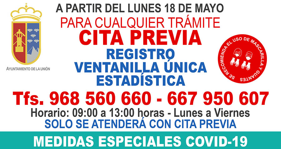 El consistorio de La Unión pone a disposición de los ciudadanos los números para contactar con los diferentes departamentos para realizar sus trámites de manera presencial a partir del 18 de mayo. Hay que solicitar cita previa a la que solamente podrá acceder una persona a las dependencias municipales.