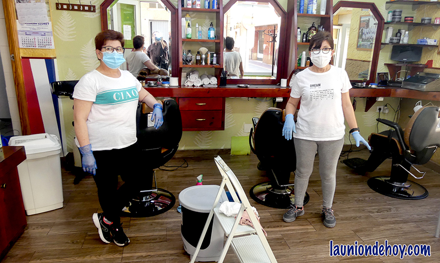 Este lunes vuelven a la actividad un sector de los establecimientos, aunque con medidas restrictivas, como aforos limitados y extremando las medidas higiénicas y de seguridad. Un ejemplo son las peluquerías, como la barbería Guerrero, que se observa en la imagen, en los trabajos de desinfección del local.
