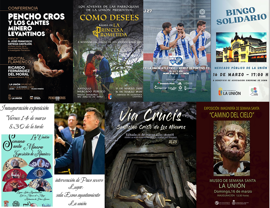 Aunque pendientes nuevamentes del clima, especialmente por al víacrucis de la mina del sábado tarde, uno de los tres actos cofrades de este fin de semana en la ciudad, mientras que en Portmán el epicentro está en la presentación de su cartel de Semana Santa. Hoy también está el tributo a Pencho Cross y mañana y el domingo se proyecta la película que han realizado los jóvenes de las parroquias de La Unión. El bingo de Asido es otro aliciente para la tarde dominical. En el deporte, La Unión Atlético defiende en casa su liderazgo, mientras que descansa 'el Ciudad'. Roche será el escenario principal de los partidos del CD Vedruna de fútbol sala y 'La Bombonera' lo será para el CB Sierramar y para la tercera jornada de la liga local de baloncesto '2001 Sport'. También se incluyen los programas de partidos de la AD La Unión y Surmenor.