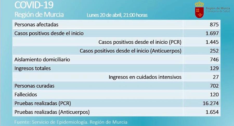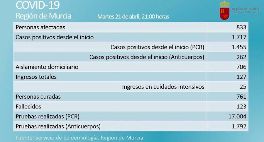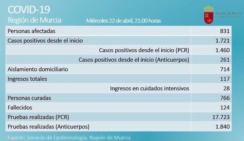 Los datos ofrecidos esta noche por el Servicio de Epidemiología de la Región de Murcia muestran un descenso de 42 personas entre los afectados por el coronavirus actualmente, además de otros descensos en ingresos hospitalarios (2) y UCI (2), mientras que los aumentos con respecto al día anterior se sitúan en fallecidos (3) y en personas curadas (59).