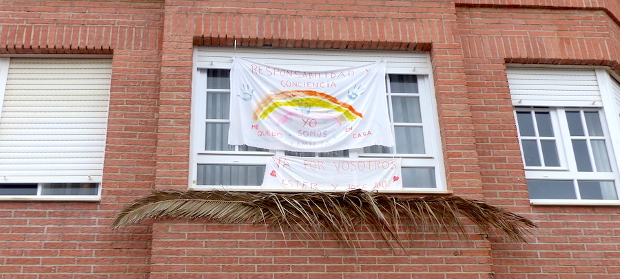 Exterior de una vivienda familiar de la plaza Ramón y Cajal de la ciudad de La Unión con un mensaje de responsabilidad y conciencia ciudadana durante el 'Estado de alarma' por el coronavirus.