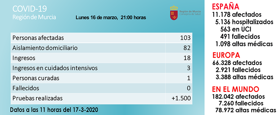 La cifra de afectados se eleva a 103 en la Región, destacando la primera alta médica de una persona que había contraído la infección. Así lo ha expresado hoy el consejero de Sanitad, Manuel Villegas, quien ha indicado que los casos leves "serán contabilizados y tendrán seguimiento", pero no serán hospitalizados ni se someterán a la prueba médica del PCR. También ha comentado que todos los mayores afectados ahora mismo son personas procedentes de otras comunidades autónomas.