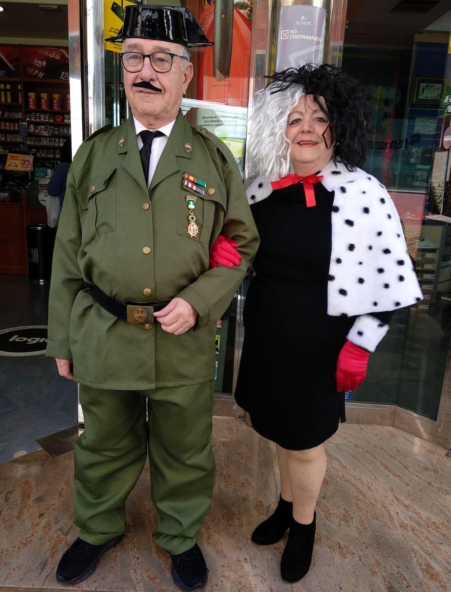 Leandro Martínez y María Dolores Quintans caracterizados de guardia civil (con medalla) y de Cruella de Vill (de la película ‘101 dálmatas’), respectivamente.