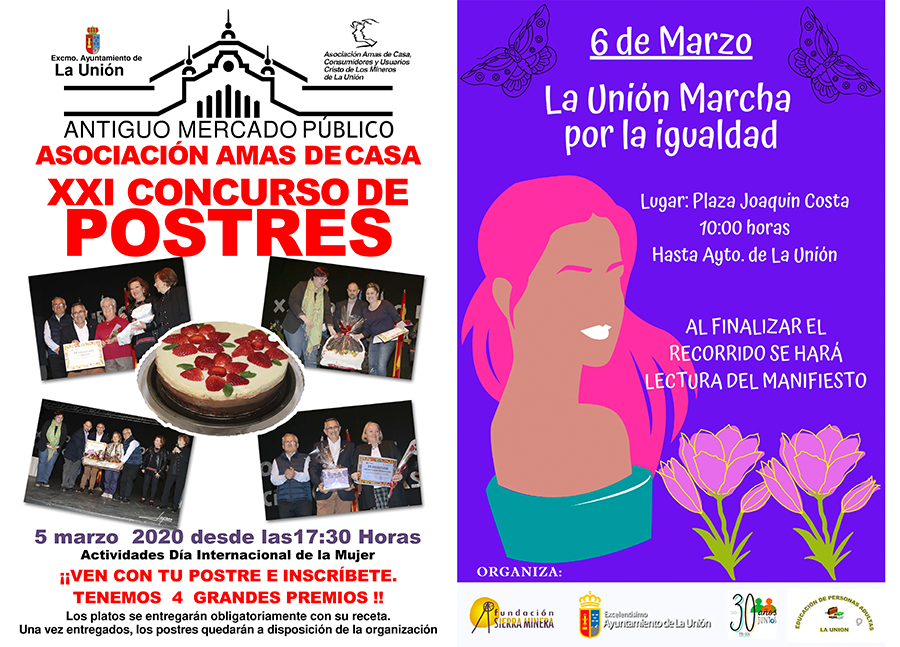 Los actos organizados por la concejalía de la Mujer con motivo del 'Día internacional de la mujer' acogerán este jueves el vigésimo primer concurso de postres en un tarde, el viernes se celebrará la marcha por la igualdad y el domingo cientos de encajeras de bolillo confluirán en el Antiguo Mercado Público.