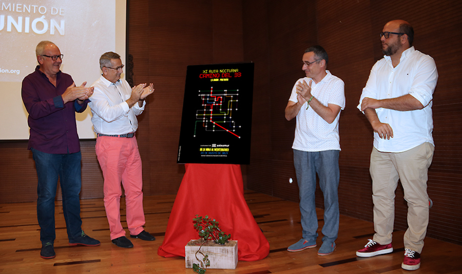 El salón de actos del ayuntamiento de La Unión ha acogido esta mañana la presentación del cartel anunciador de la décimo primera edición de la ruta 'Camino del 33: De la mina al Mediterráneo', obra de Onésimo Hernández, quien ha plasmado la ruta entre La Unión y Portmán imitando las señalizaciones de las líneas de metro y de autobuses urbanos.