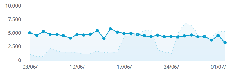 El pasado mes ha dejado las mejores cifras de lectores desde que surgió el periódico de La Unión en octubre de 2011. Dimos un estirón en mayo con motivo del las elecciones municipales (media de 4.793), pero ese incremento no ha mermado y junio ha registrado una media diaria de entradas desde ordenadores diferentes de 4.813 internautas (los equiparamos a lectores distintos), cifra que nunca habíamos registrado en ese mes. Además, también nos ha llamado la atención que se ha producido de forma muy regular, sin grandes altibajos por acontecimientos puntuales.