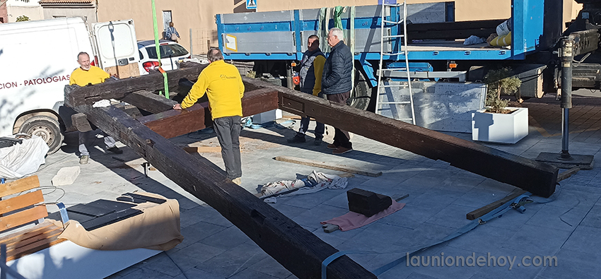 La estructura de la actividad minera propia de hace décadas se está instalando hoy en la plaza del Museo Minero, espacio que culminó su cambio de imagen hace un año. Se trata del castillete que antes estaba situado delante del centro cultural Asensio Sáez y que se ha restaurado.