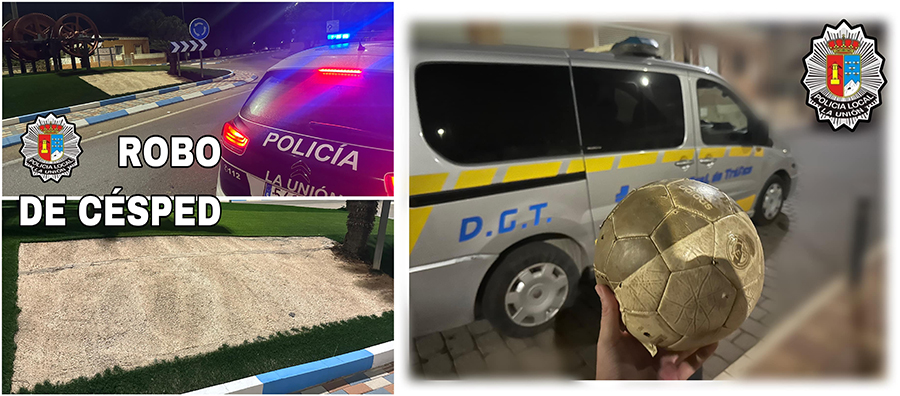La Policía Local de La Unión informa de la sustracción de un trozo de césped artificial de la rotonda del Lazareto y pide a la población ayuda para localizar al autor. Por otro lado, agentes del cuerpo denunciaron a un hombre que a las tres y media de la madrugada no dejaba dormir a vecinos dando balonazos en una plaza pública.