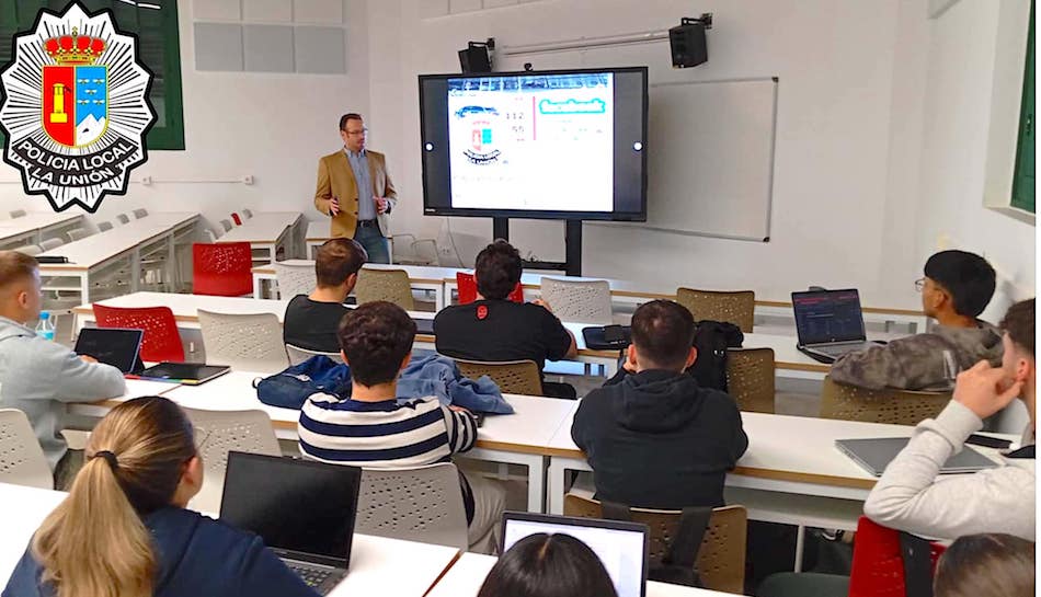 Juan Luis Segado, agente de la Policía Local de La Unión y administrador del perfil en Facebook del cuerpo, ha acudido hoy a las aulas de ISEN Formación, sede en Cartagena de la Universidad de Murcia, donde ha hablado a los alumnos del grado de Seguridad del trabajo policial y de la gestión de las redes sociales.