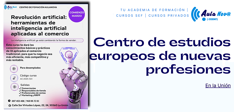El futuro no es mañana, es ahora y el pequeño comercio que aprenda a usar Inteligencia Artificial será el que marque la diferencia. Este nuevo curso de Aula Nova te formará en sus instalaciones de La Unión con los conocimientos básicos y prácticos de IA aplicados a este sector para ganar eficiencia y rentabilidad.