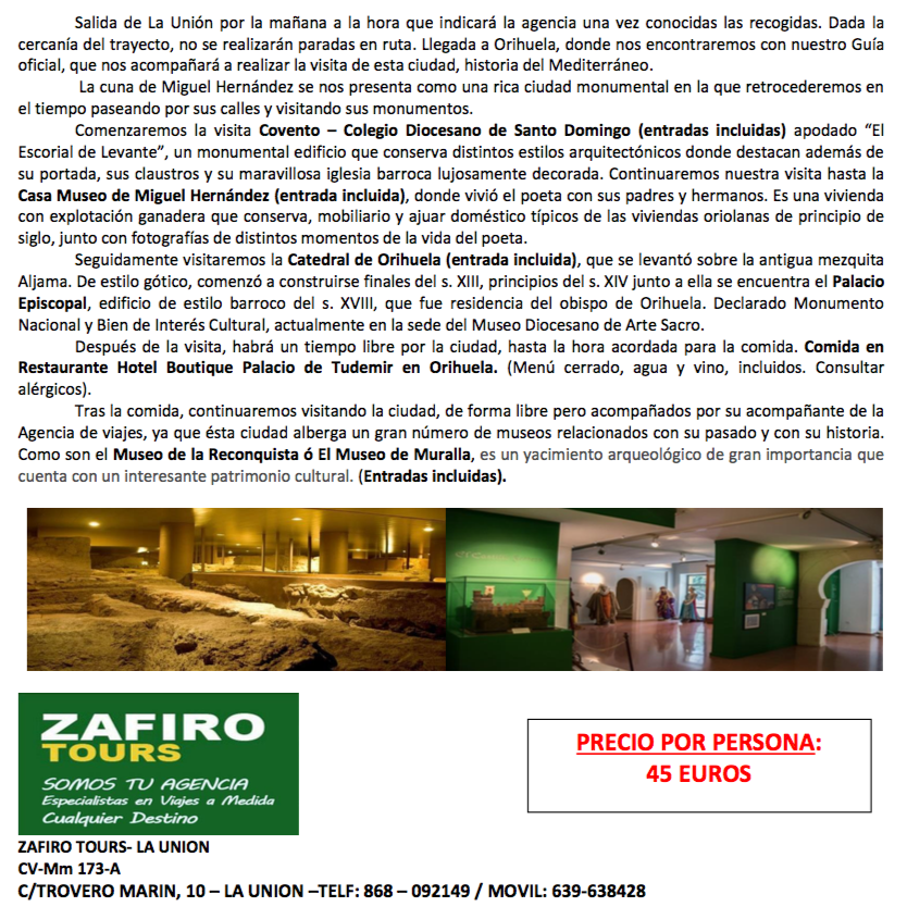 Zafiro Tours organiza un viaje a la cuna de Miguel Hernández para el próximo 19 de octubre con salida desde La Unión.