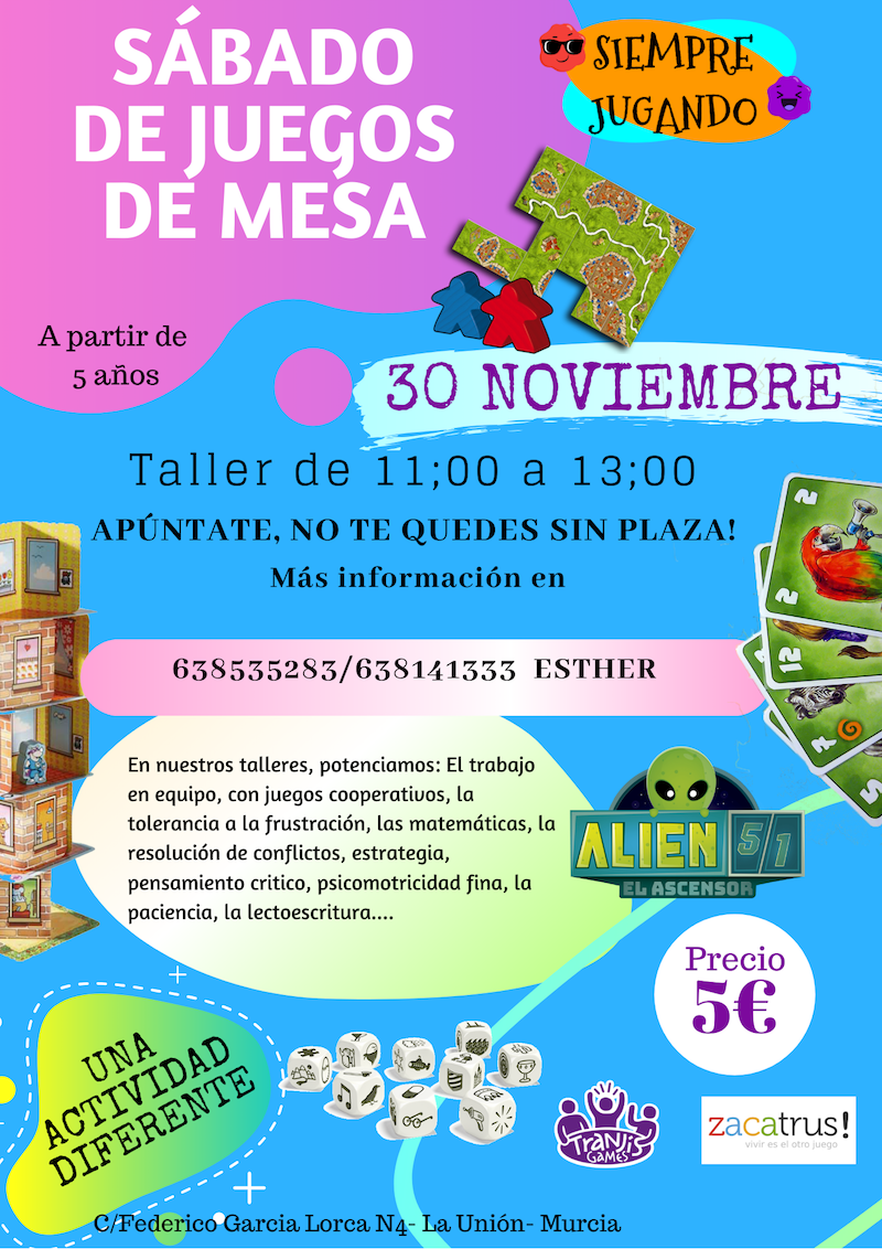 El taller se celebrará este próximo sábado en la sede de la escuela de la calle Federico García Lorca (lateral del Mercado Público) de La Unión. Os recordamos que vuestros hijos no sólo juegan en nuestros talleres, si no que también aprenden y ejercitan muchas cualidades.