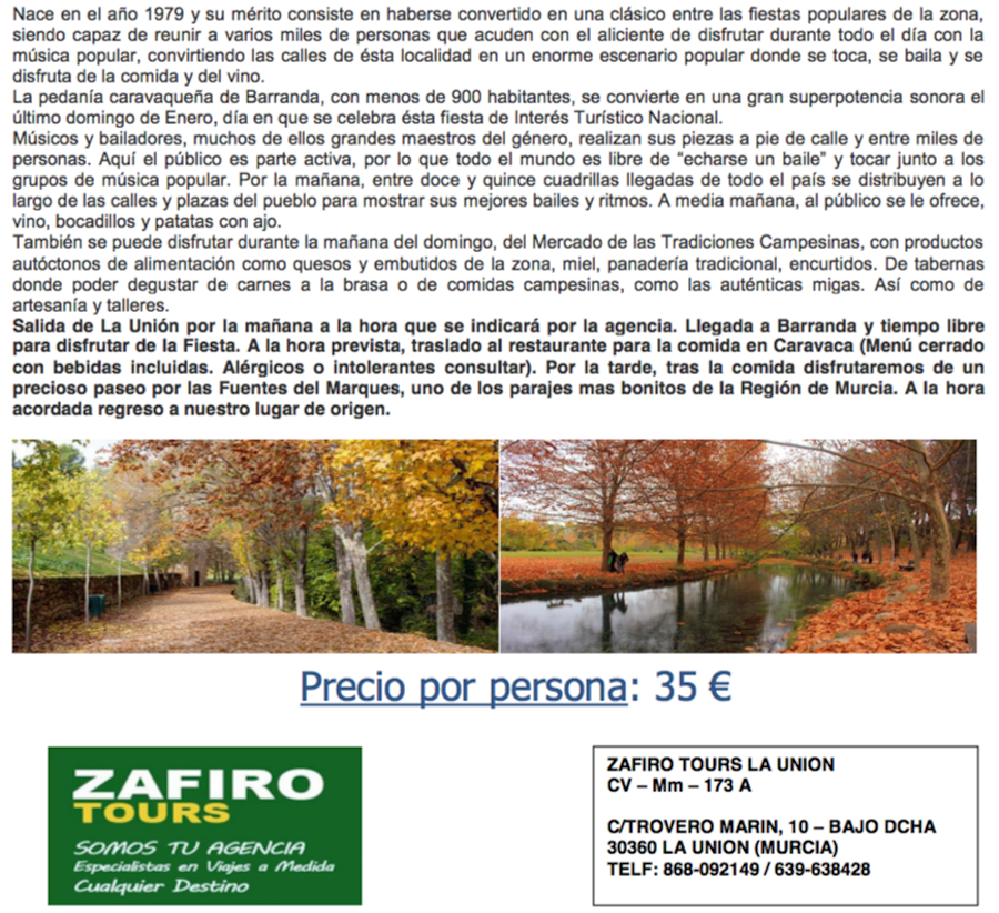Tu agencia de viajes de La Unión organiza un viaje con mucho sabor y cargada de sonido a Barranda para el último domingo de este mes, que se complementa por la tarde con un paseo por las Fuentes del Marqués. Todo, incluidos menú y seguro, por sólo 35 euros.