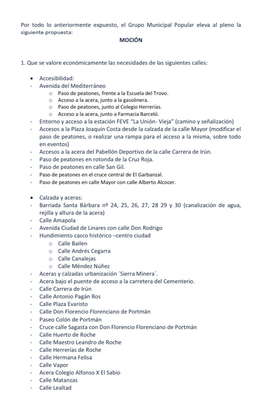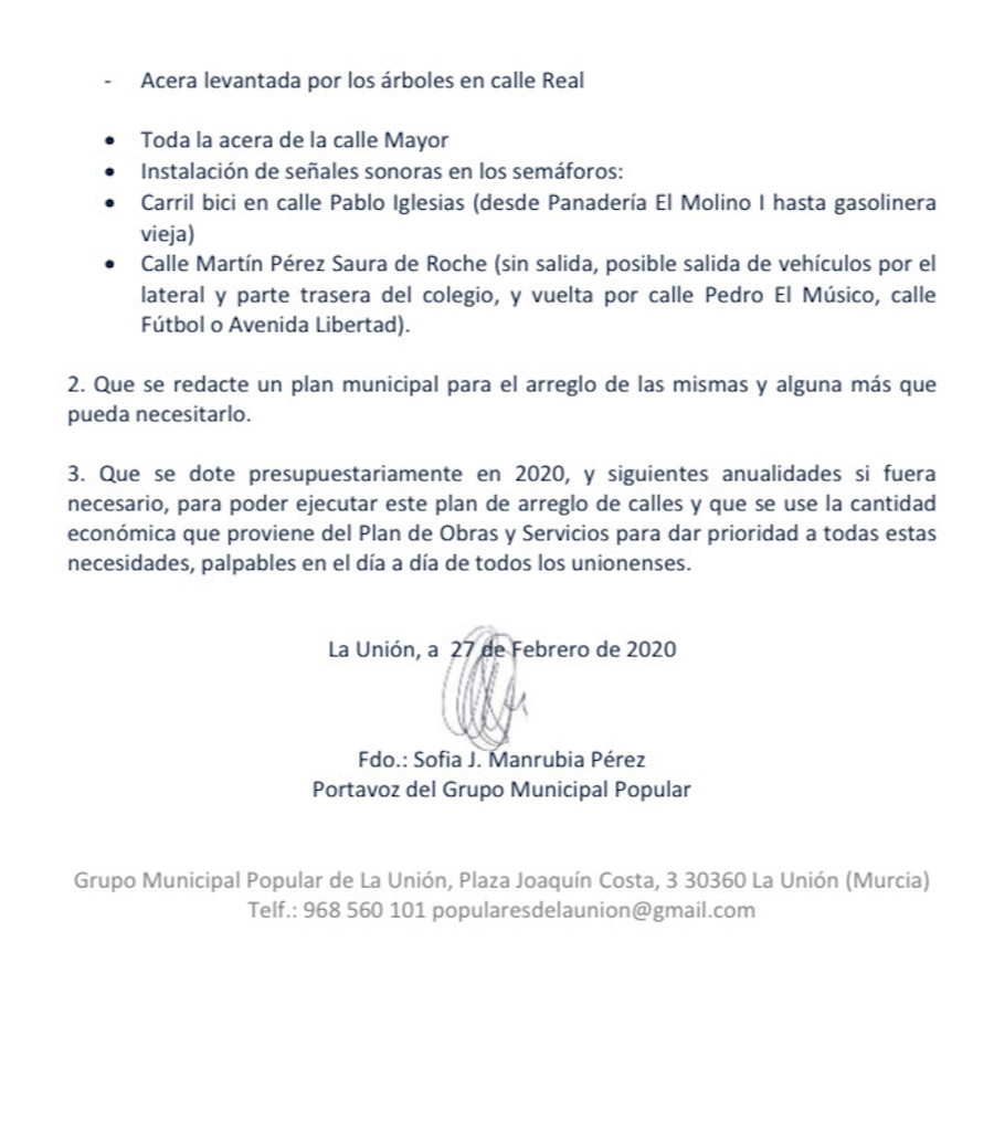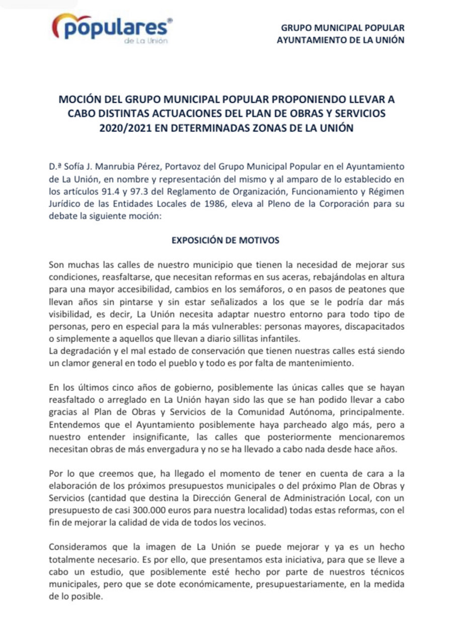 El grupo municipal del Partido Popular de La Unión ha presentado una moción en el Ayuntamiento sobre el arreglo de las vías de nuestra localidad dentro del Plan de Obras y Servicios del Gobierno Regional.