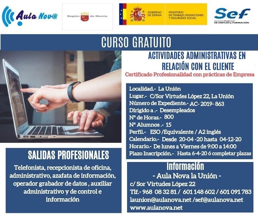 'Gestión contable y gestión administrativa para auditoría' y 'Actividades Administrativa en relación con el cliente' son los dos nuevos cursos que el Servicio Regional de Empleo y Formación ha concedido al centro de formación de La Unión con importantes salidas laborales. Debido a la situación generada por el coronavirus, las fechas para su celebración se retrasarán, pero se puede efectuar ahora la inscripción.