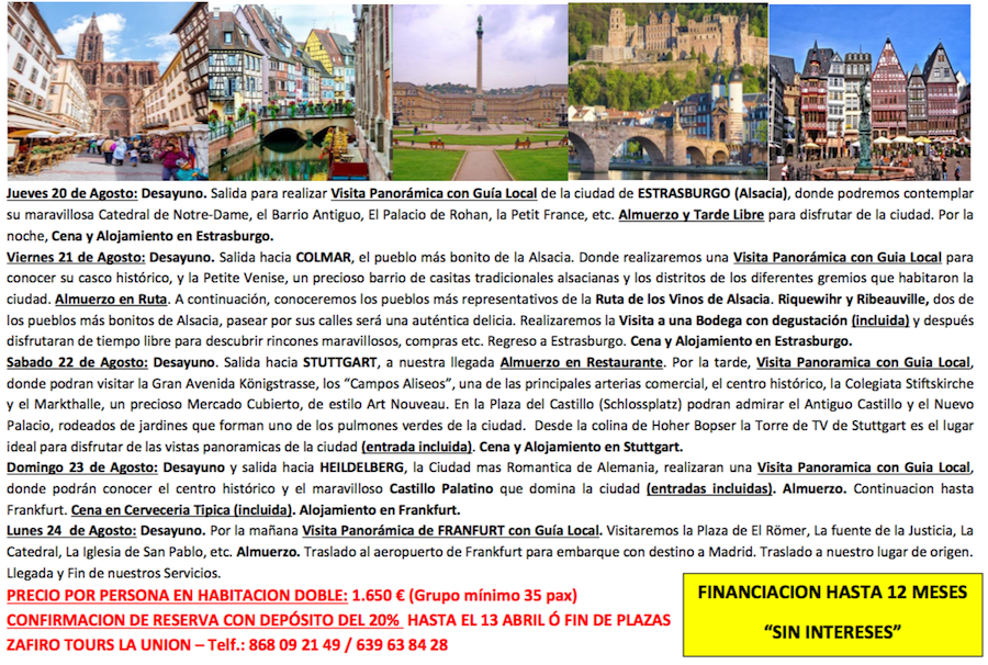 El confinamiento actual debido al coronavirus llegará a su final y entonces se irá recuperando la normalidad, pero, quizás, por el tiempo de 'encierro', no venga mal un buen viaje. Una opción a barajar la ofrece Zafiro Tours de La Unión con Alemania, Selva Negra y Alsacia del 17 al 24 de agosto a un precio estupendo con financiación sin intereses durante un año.