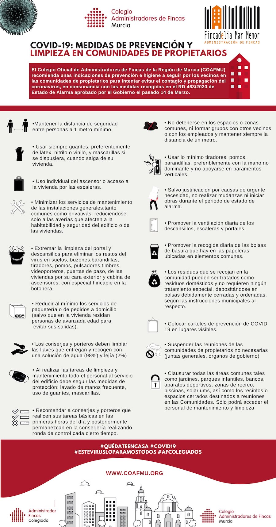 Fincadelia Mar Menor, la empresa unionense de administración de fincas que dirige José Pérez Martínez, da a conocer los consejos del Colegio de Administradores de Fincas de la Región de Murcia dirigidos a los vecinos de las comunidades de propietarios con el objetivo de evitar contagios del coronavirus.