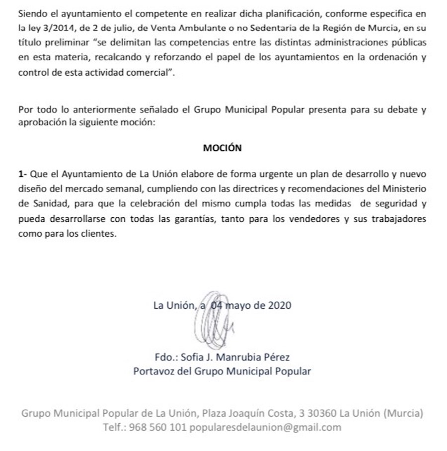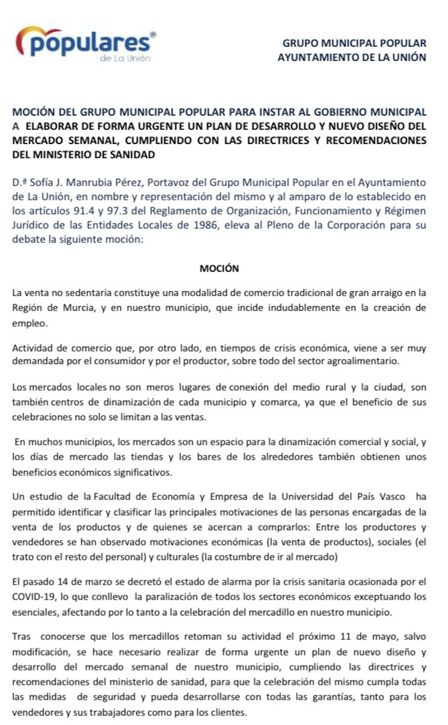 El Partido Popular de La Unión presenta una moción en la que le exige al alcalde elaborar de forma urgente un plan de desarrollo y nuevo diseño del mercado semanal, cumpliendo con las directrices y recomendaciones del Ministerio de Sanidad, para que la celebración del mismo cumpla todas las medidas de seguridad y pueda desarrollarse con todas las garantías, tanto para los vendedores y sus trabajadores como para los clientes. Con el fin de que el próximo martes 12 de mayo, y tal y como marca la fase de desescalada de este 'Estado de alarma', estos vendedores puedan tener las mejores condiciones para poder desempeñar su venta, y disponer de los derechos como cualquier otro comercio de la localidad.