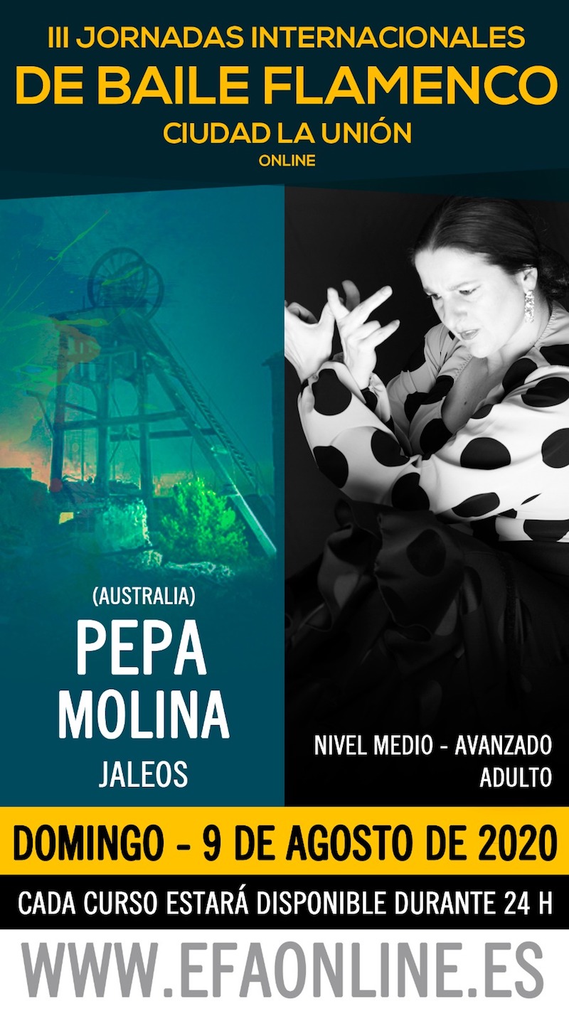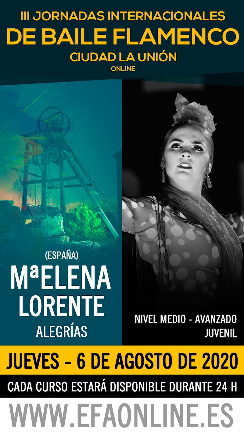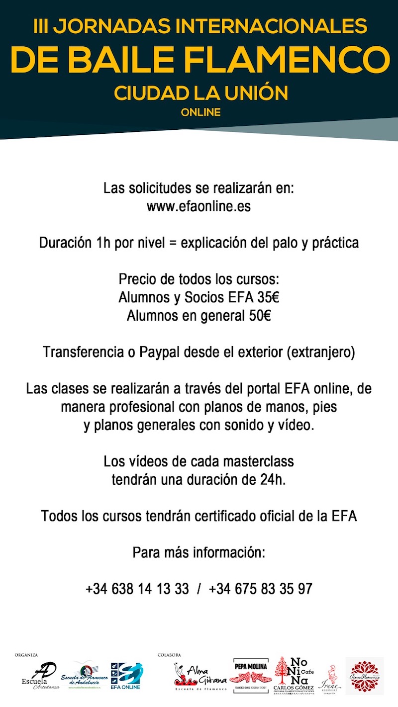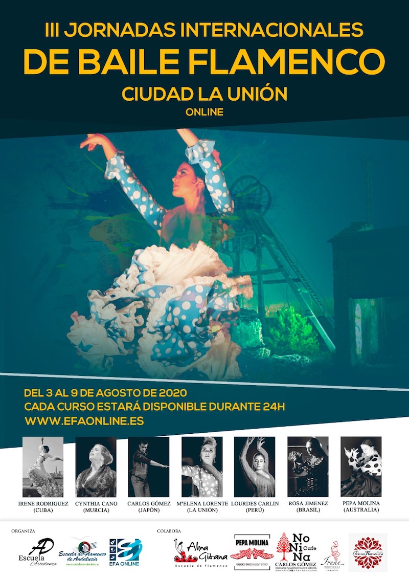 Organiza la Escuela ArteDanza, sede oficial de la Escuela de Flamenco de Andalucía en La Unión. Todos los cursos tendrán certificado oficial de la EFA. Las jornadas contarán con la participación de grandes profesores de la EFA de España, Cuba, Japón, Perú, Brasil y Australia. Tendrá lugar del 3 al 9 de agosto de forma telemática y cada curso estará dispone en internet sólo durante 24 horas.