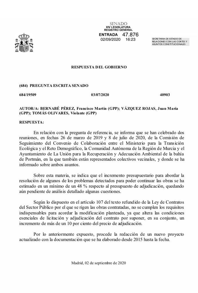 Así se desprende de la contestación oficial del Gobierno de España a la pregunta de nuestro senador y presidente local, Francisco Bernabé, en la que cifran el coste de reanudar los trabajos en el 48% del precio de adjudicación, que fue de 31 millones de euros, es decir, tan sólo 15 millones más que ayudarían de forma definitiva a ver la luz a un municipio de más de 20.000 habitantes como es La Unión.