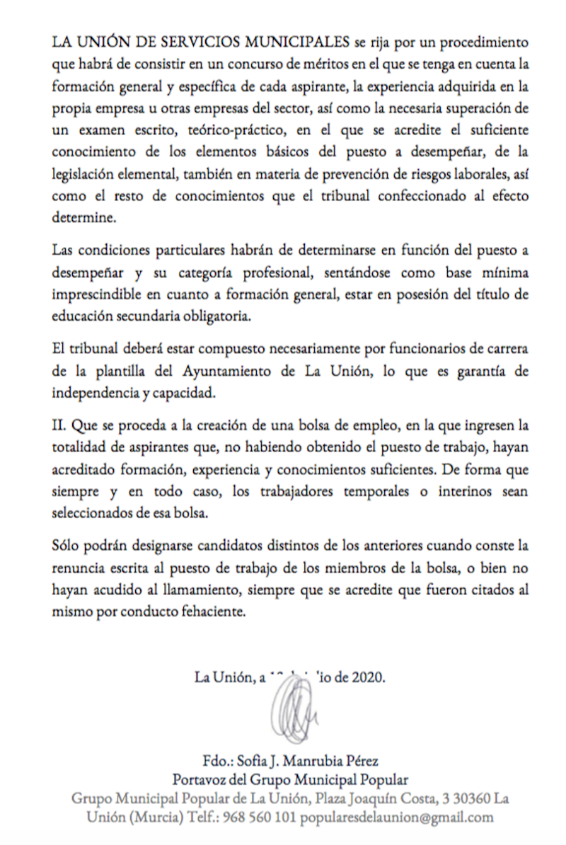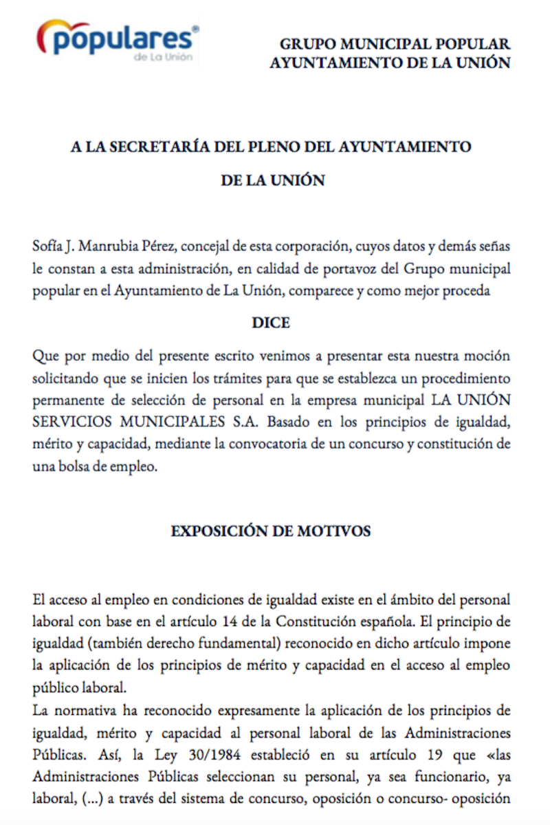El Partido Popular de La Unión lleva al consejo de la Unión de Servicios Municipales una moción para la creación de una bolsa de empleo que acabe con los contratos a dedo en la empresa.