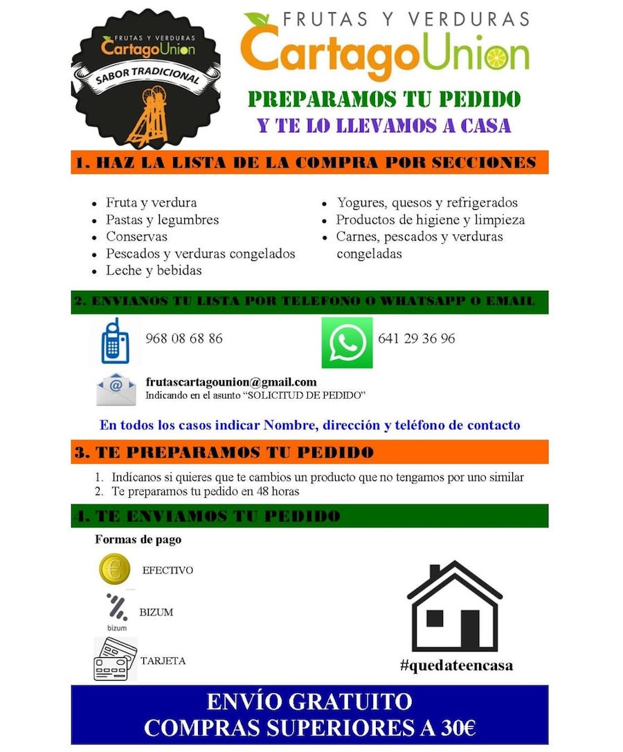 El comercio unionense de frutas y verduras quiere poner su 'granito de arena' para facilitar que, en esta 'tercera ola' del coronavirus, los vecinos no tengan que salir de casa y para ello habilita un procedimiento sencillo para preparar el pedido, el cual te lo llevan hasta casa.