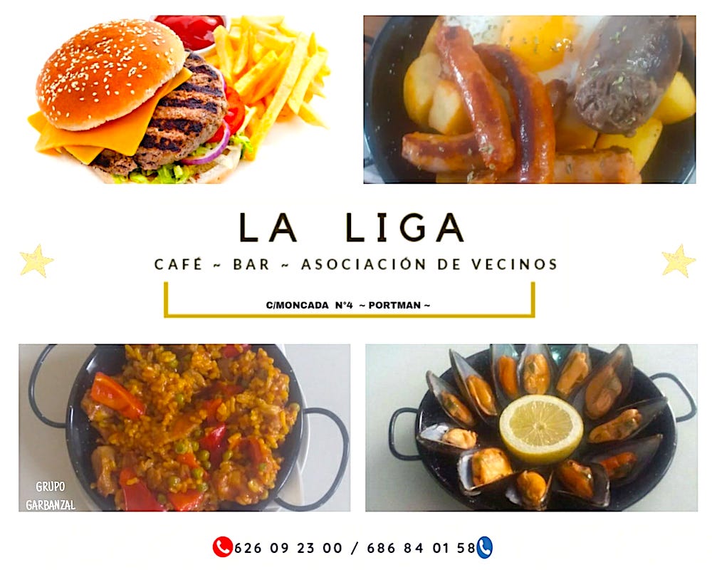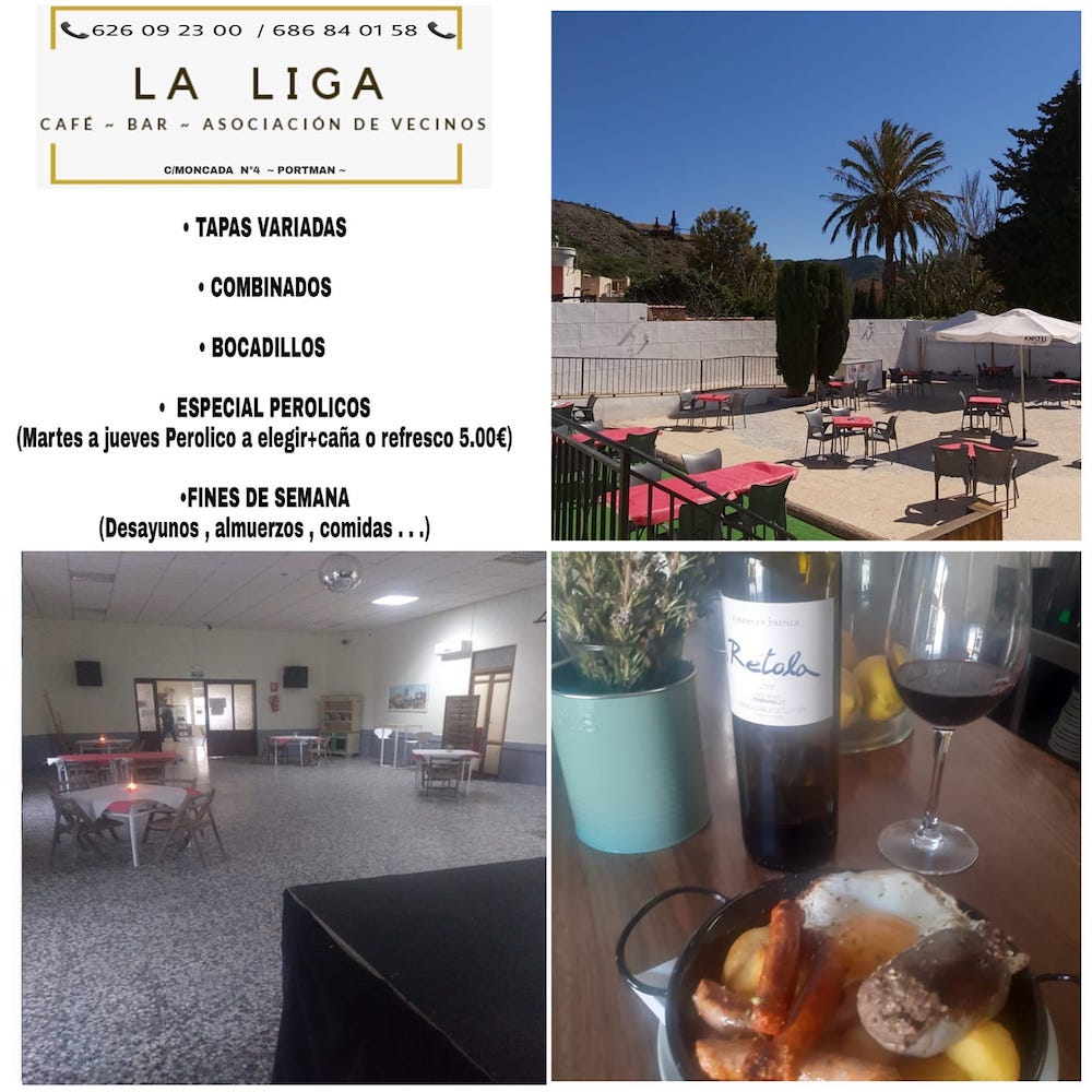 Café-Bar 'La Liga' Asociación de Vecinos ofrece a vecinos y visitantes de Portmán una carta con gran variedad de tapas, junto a combinados y bocadillos.