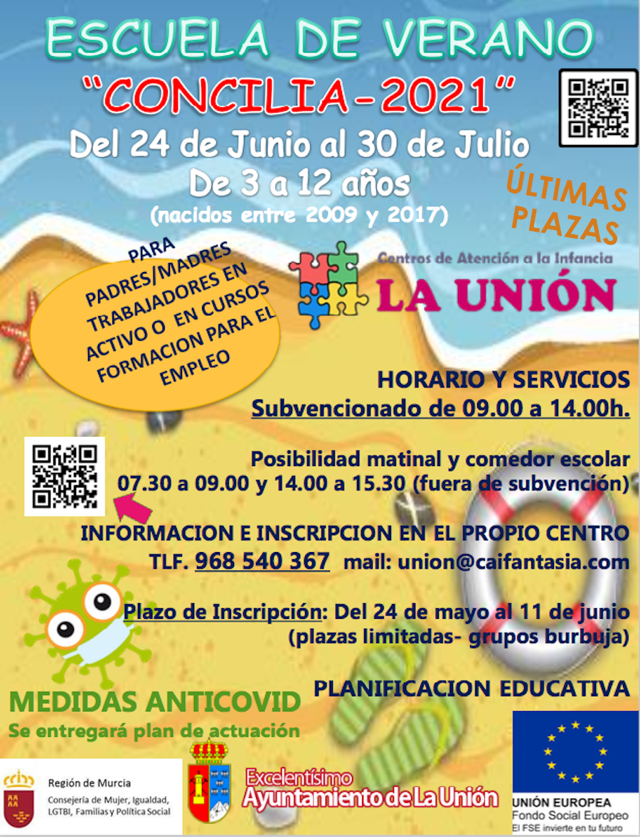 El centro del atención a la infancia de La Unión organiza su escuela estival del 24 de junio al 30 de julio para chavales de 3 a 12 años de edad dirigido a padres y madres trabajadores en activo o en cursos de formación para el empleo. Horario subvencionado de 9 a 14 horas. Posibilidad de comedor.
