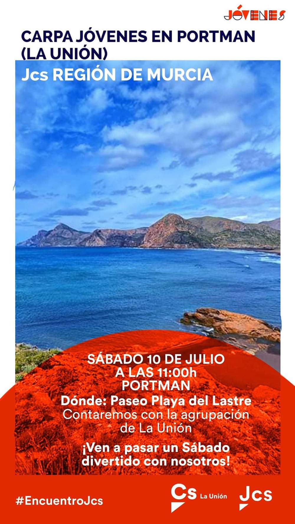 Jóvenes Ciudadanos Región de Murcia organiza para este próximo sábado, 10 de julio, junto a la agrupación local de La Unión una carpa informativa en el Paseo de la Playa del Lastre (Portmán) a partir de las 11:00h. Se trata de la primera actividad de verano de la agrupación de Jóvenes de Cs en la Región de Murcia. “Es la primera de varias actividades que tenemos preparadas para este verano en Jcs con las que buscamos acercar el proyecto naranja a todos los rincones de la Región”, ha declarado la adjunta autonómica de Jcs, Gloria Montoro Rufete, quien ha destacado también que con estas actividades “queremos también mostrar el potencial turístico de nuestra Región y nuestro compromiso con el Medio Ambiente, por esta razón comenzamos en Portmán, un enclave único y tristemente afectado por la contaminación”.