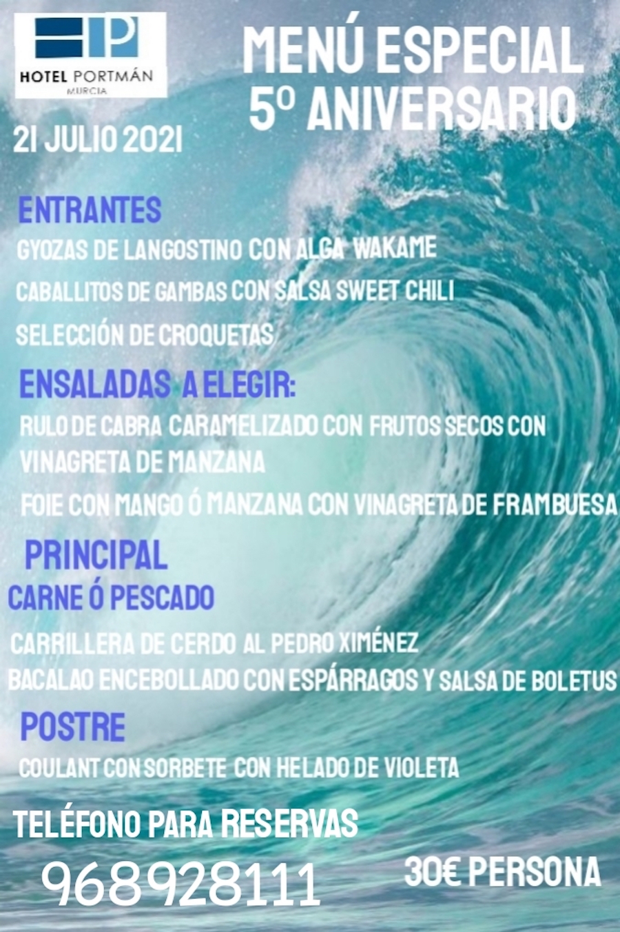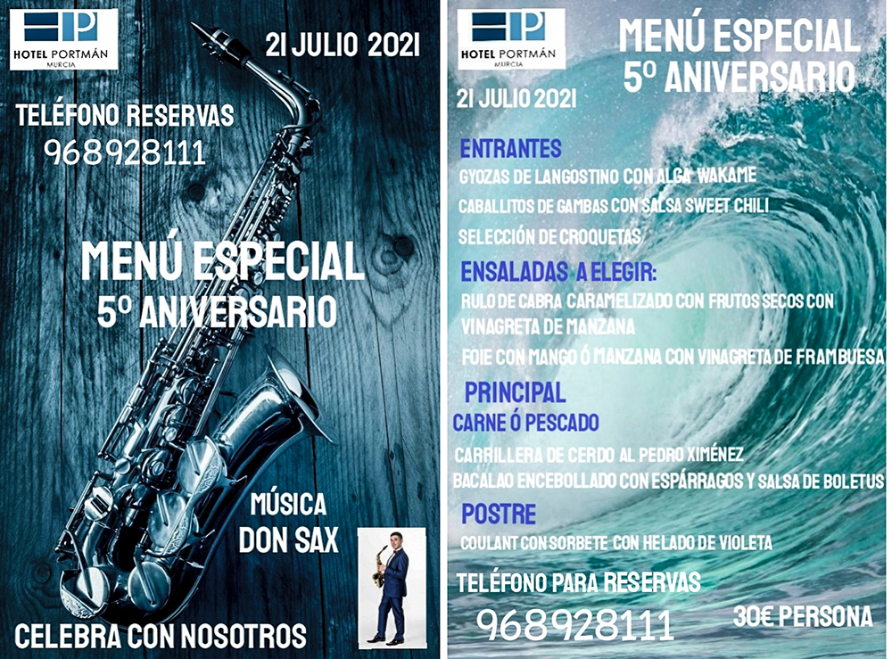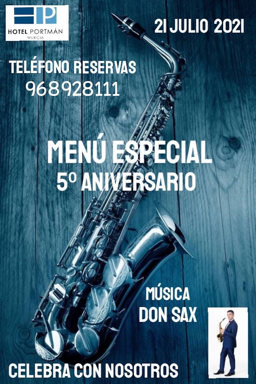 La celebración tendrá lugar el 21 de julio, miércoles de la próxima semana, con un menú muy especial y la actuación de Don Sax. Reserva ya a través del teléfono 968 92 81 11 y celebra este aniversario con nosotros.