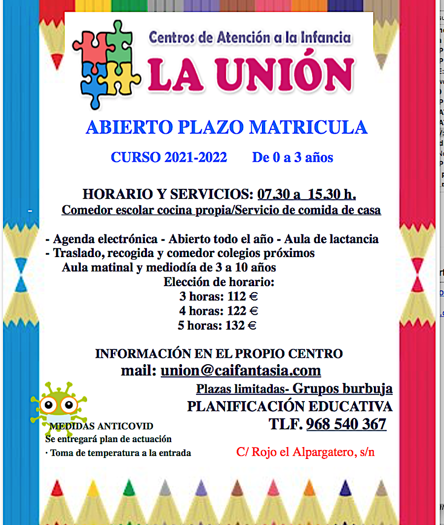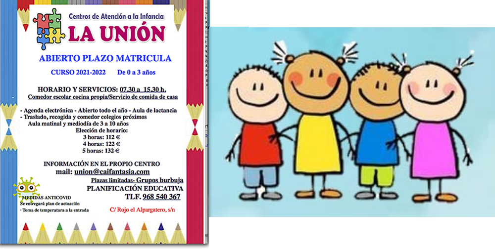 El centro de atención a la infancia ubicado en la calle Rojo El Alpargatero ha abierto e plazo de matrícula para niños de 0 a 3 años de edad de cara al próximo curso. Ven e infórmate de nuestra completa propuesta: comedor escolar con cocina propia, servicio de ocmida de casa, aula de lactdancia, traslado y recogidas, elección de horarios, grupos burbuja… No tardes, pues las plazas son limitadas.