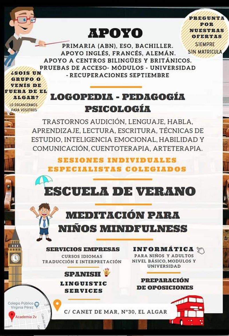 En Academia 2v hemos empezado a organizar el nuevo curso con los diferentes grupos y horarios de todas nuestras actividades...¿Conoces nuestros servicios? En este artículo te los damos a conocer. Recuerda que te ofrecemos la opción de estar en grupos, grupos reducidos o con clases individuales. Siempre nos adaptamos a ti.