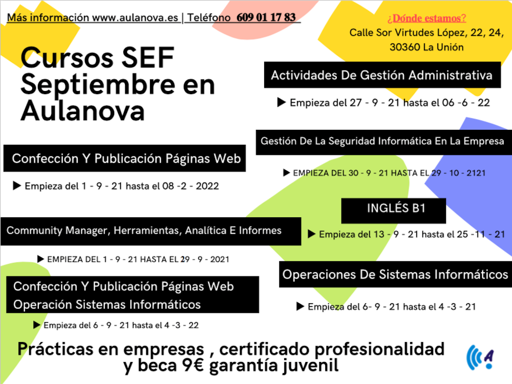 La mayoría de vecinos vuelven a la normalidad tras la etapa vacacional y desde la academia de formación de La Unión os recordamos que este nuevo mes os ofrecemos un buen número de cursos gratuitos del SEF (Servicio de Empleo y Formación) con prácticas en empresas y garantía juvenil (beca de 9 euros diarios).