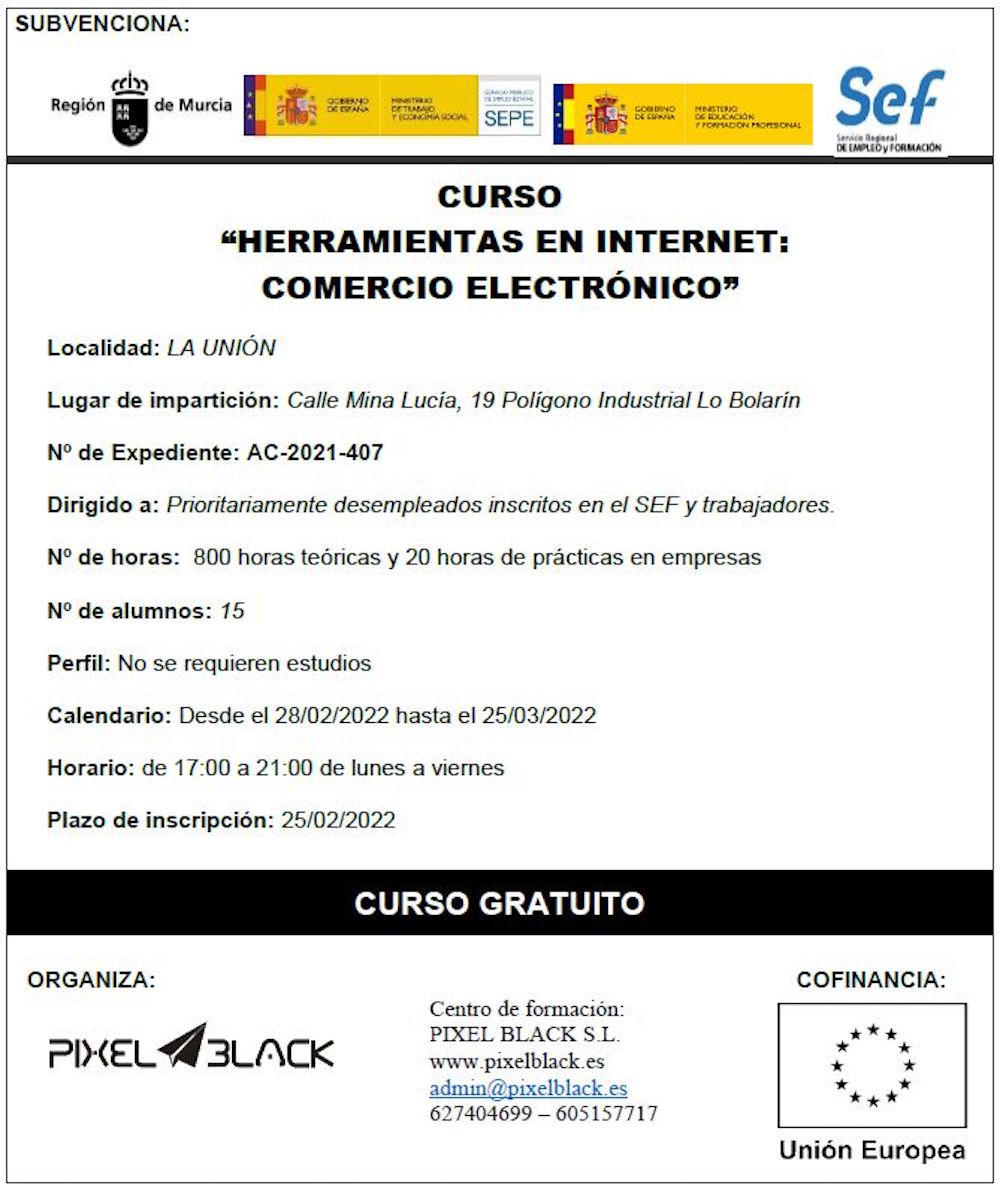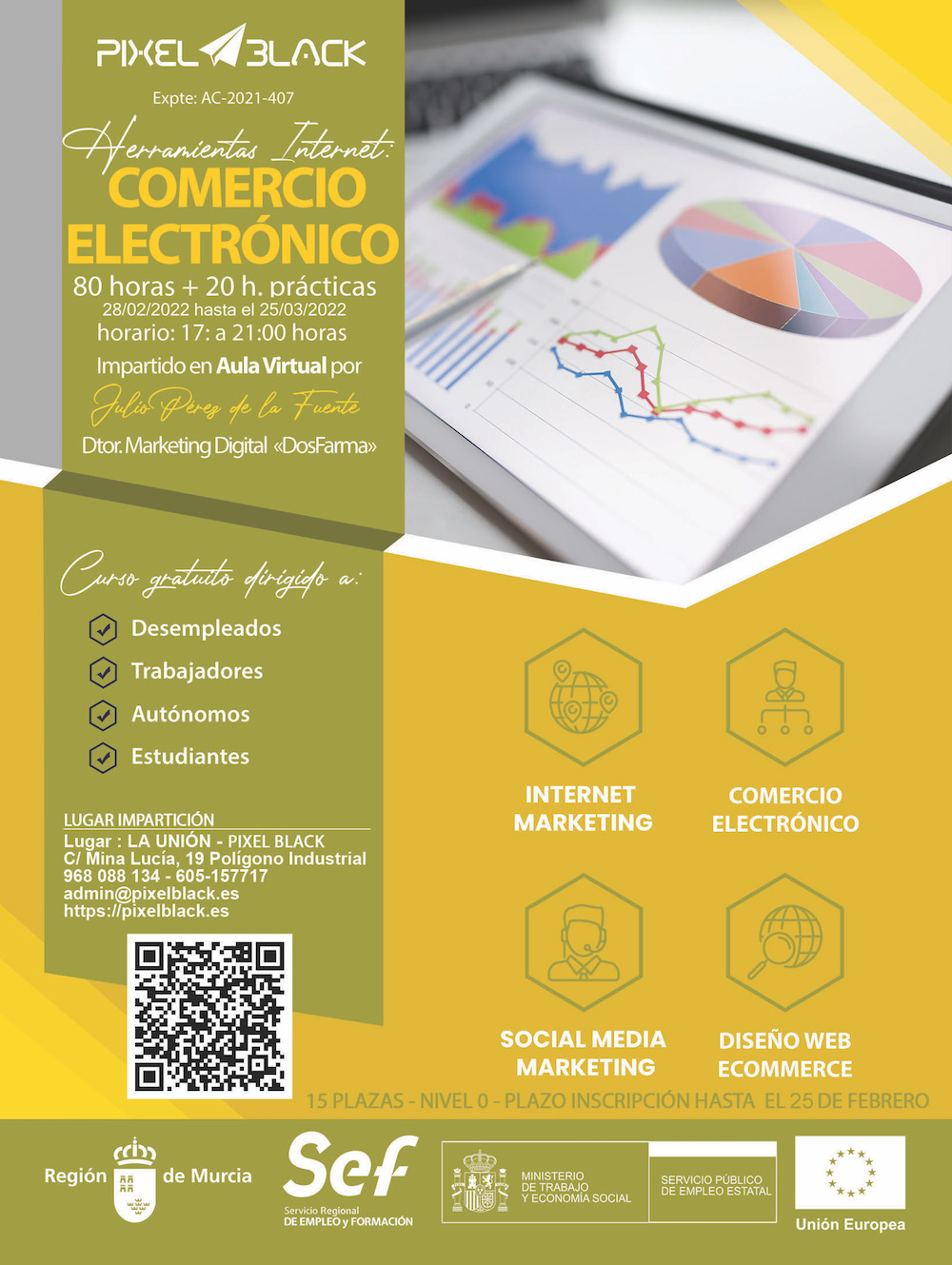 El curso gratuito del SEF, que consta de 80 horas de clases en el aula de Pixel Black en el polígono industrial de Lo Bolarín, más 20 de prácticas, será impartido por Julio Pérez de la Fuente, director de márketing digital 'DosFarma'.