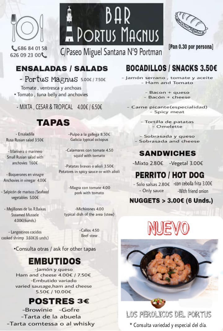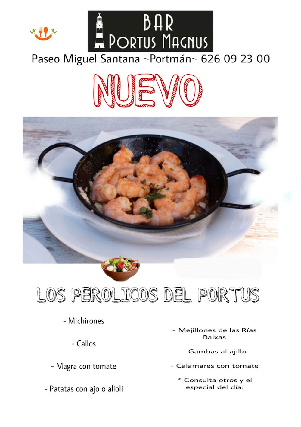 Es una propuesta nueva en la que Bar Portus Magnus lleva trabajando desde hace un tiempo y que este fin de semana se estrenarán. Michirones, callos, magra contomate, patatas con ajo, mejillones, gambas al ajillo, calamares con tomate, etc. Cada día habrá una especial. Ven a tu bar de encuentro ubicado en el paseo de Miguel Santana de Portmán y disfruta de tomas las tapas de una forma diferentes. Tenemos más novedades de las que próximamente informaremos...