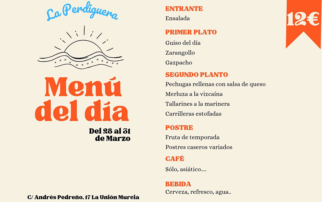 Guiso del día, gazpacho o zarangollo para elegir como primer plato. Pechugas rellenas con salsa de queso, tallarines a la marinera, merluza a la vizcaína o carrilleras estofadas. Todos riquísimos para elegir uno como segundo. El precio es de 12 euros con bebida, postre y café incluidos. Cada semana renovamos el contenido del menú, que servimos de martes a viernes. Ven y disfrúta calidad en el sabor en el mejor precio. Estamos en la calle Andrés Pedreño de la ciudad de La Unión.