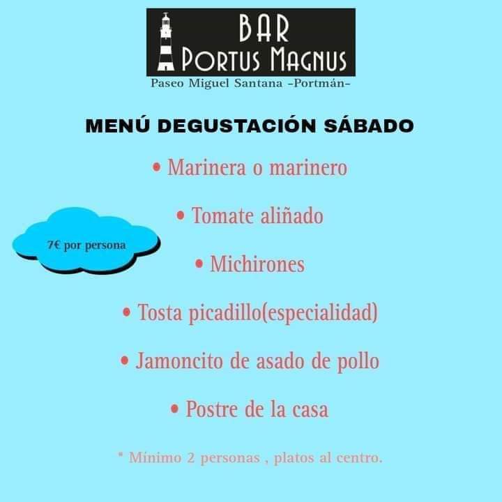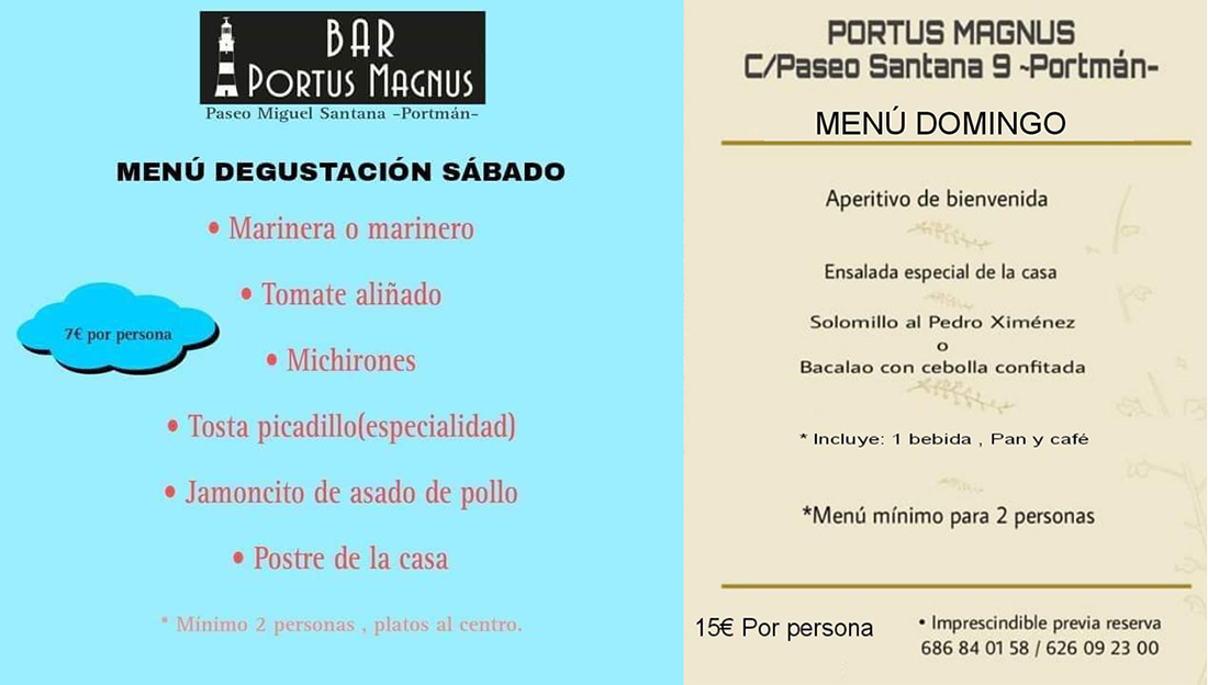 En el establecimiento hostelero de Portmán comenzamos esta noche con los 'Viernes locos', donde tienes pinchos gratis, música y copas (oferta: copas en tubo por 3.50 euros toda la noche). Para el sábado te ofrecemos nuestro menú degustación por sólo 7 euros y el domingo elaboramos un menú especial. Muy importante: reserva previa.