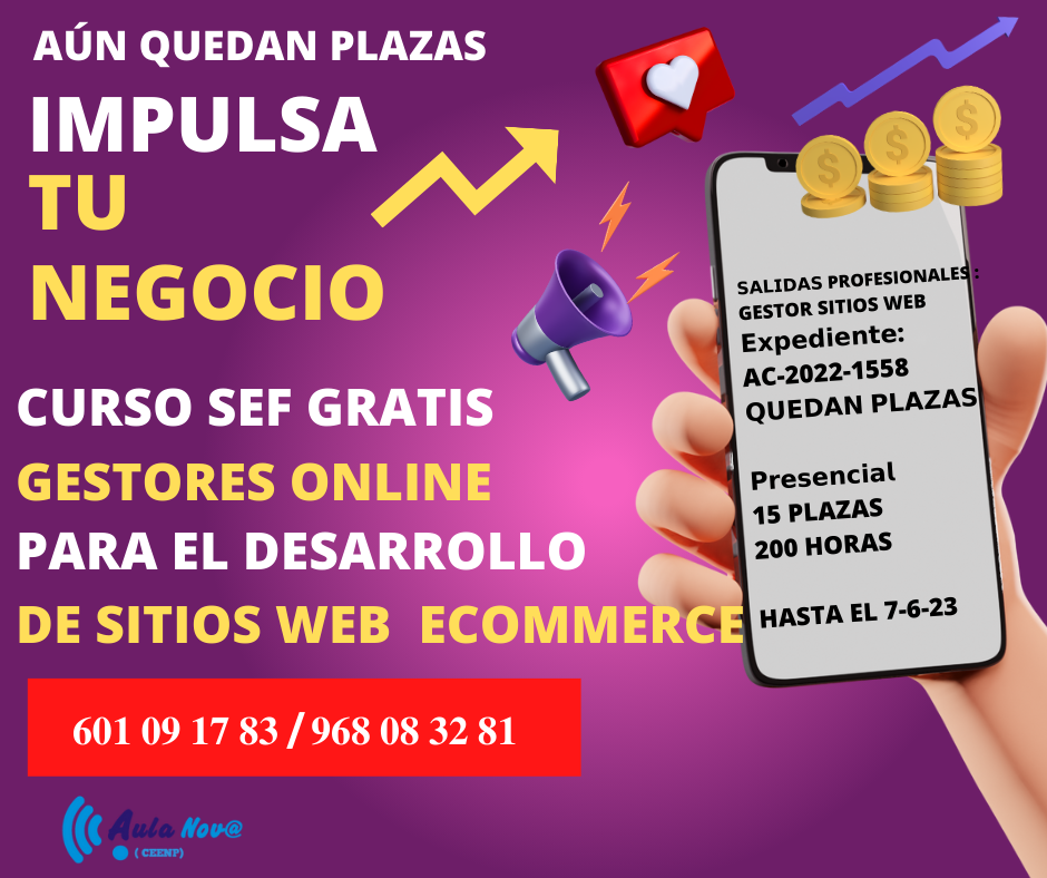 Aula Nova, tu centro de formación en La Unión, te propone el curso gratuito SEF: Gestores online para el desarrollo de sitios web y e-commerce. Doscientas horas de clases presenciales. Todavía quedan plazas para este curso con muchas salidas a nivel profesional. Comienza a prepararte para el futuro y aporta un valor añadido a tu currículum desde ahora.