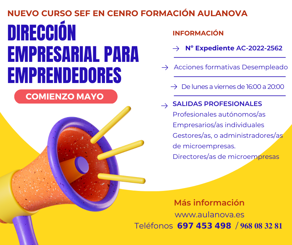 Aula Nova lanza un nuevo curso gratuito del SEF en sus instalaciones de La Unión para que te conviertas en un líder empresarial exitoso. Si eres un emprendedor, empresario individual o societario de microempresas, o estás interesado en gestionar o administrar microempresas, este curso de 'Dirección empresarial para emprendedores' es perfecto para ti.