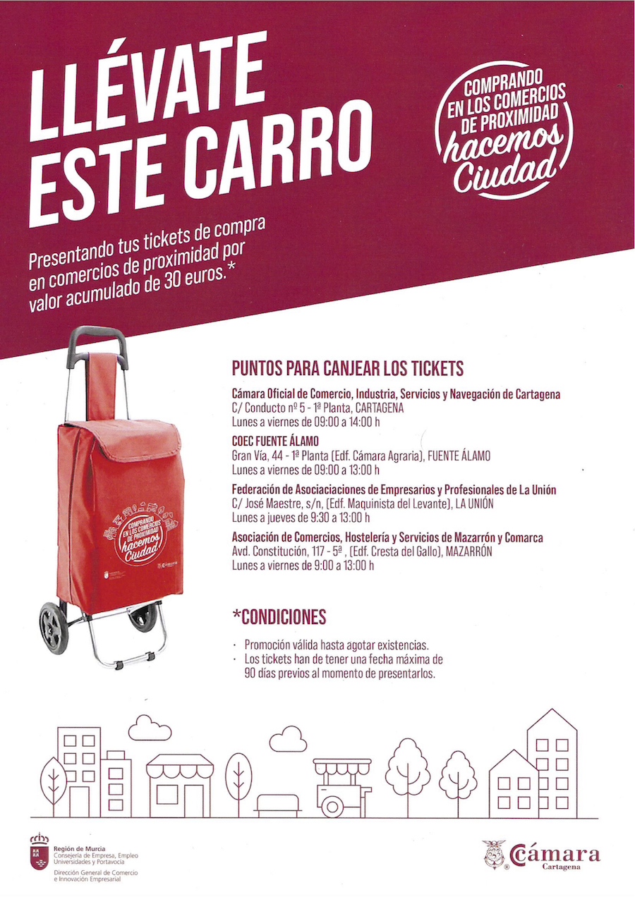La Cámara de Comercio de Cartagena, en colaboración con FAEPU y con el patrocinio de la dirección general de Comercio e Innovación Empresdarial, ha diseñado una campaña para promocionar el comercio minorista, consistente en la entrega de un carro de compra a aquellos consumidores que lo justifiquen con tiques por compras iguales o superiores a 30 euros en el comercio de La Unión, con una fecha máxima de 90 días previos al momento de presentarlos en establecimientos comerciales de la localidad.