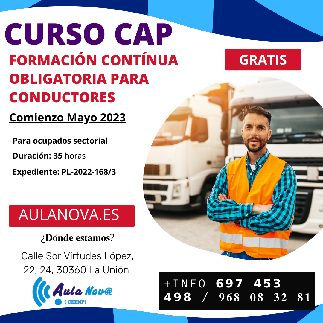 Este mes de mayo, en tu centro de formación de Aula Nova, empieza un curso gratuito CAP para el desarrollo de tus habilidades profesionales: CAP - Formación continua obligatoria para conductores. Capacita al conductor para mantener actualizados los conocimientos inicialmente exigidos a los conductores. Comienza a prepararte para el futuro y aporta un valor añadido a tu currículo desde ahora.
