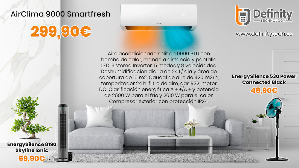 AirClima 9000 Smartfresh te puede hacer que te olvides del calor cuando estés en tu hogar o centro de trabajo. en Definitity Technology te lo ofrecemos a un precio increíble. También tenemos otros sistemas para refrescarte. Visítanos en nuestro establecimiento de la calle Mayor de La Unión a través de la web www.definitiytech.es