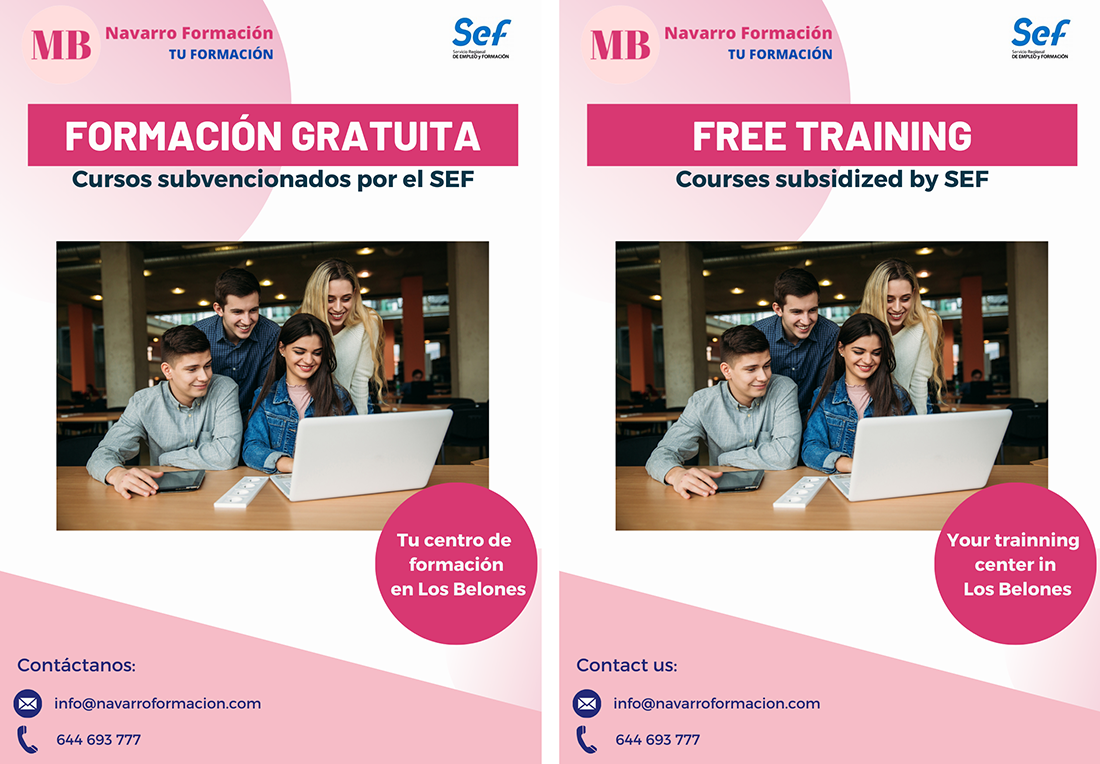 Tenemos una amplia oferta de cursos de formación totalmente gratuita al estar subvencionados por el Servicio de Empleo y Formación (SEF) de la Comunidad Autónoma. Contacta con nosotros por correo electrónico o teléfono (644 693 777) para recabar la información que necesites. El centro de formación lo tenemos en Los Belones.