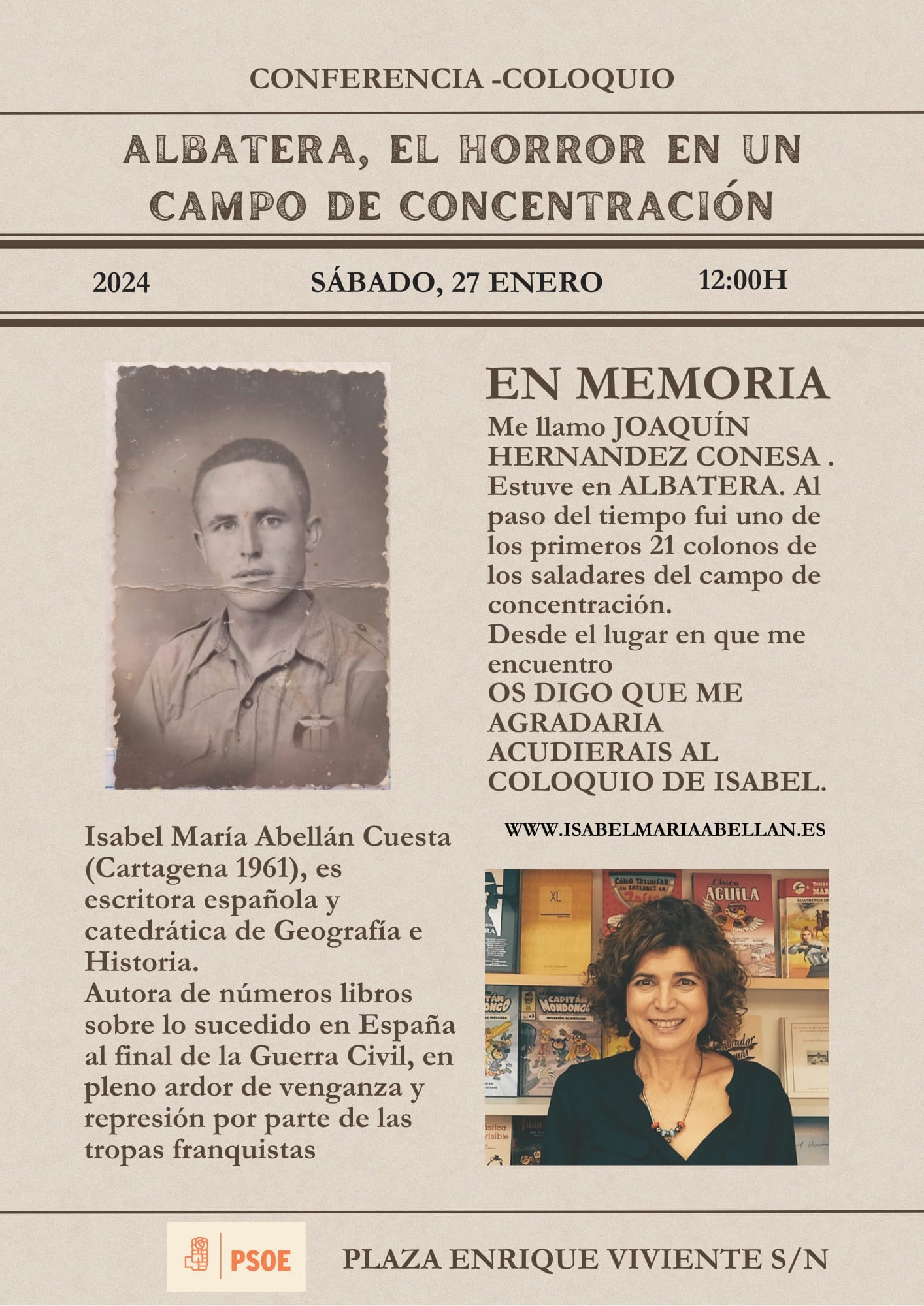 El 27 de enero, sábado, a las 12 horas en la sede del PSOE de La Unión, en la plaza de Enrique Viviente, Isabel María Abellán Cuesta, escritora y catedrática de Geografía e Historia, impartirá una conferencia sobre el campo de concentración en San Isidro (Alciante) tras concluir la Guerra Civil, siendo uno de los más duros que hubo en España. Como acto previo, se realizará una ofrenda floral frente al mural en memoria de los unionenses fallecidos en el campo de concentración de Mauthausen, a las 11 horas.